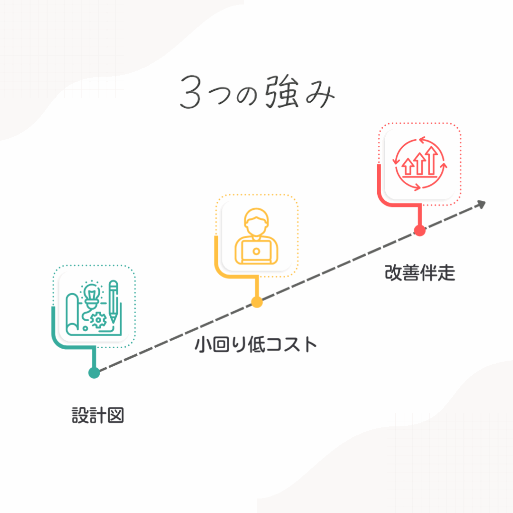 大きな制作会社と違い、代表が直接対応する少数体制だからこそ、決定が速く融通も利きます。必要最小の制作物だけをオーダーメイドで提供し、余計な間接コストをかけずに納期も費用も抑えられる点が大きな強みです。